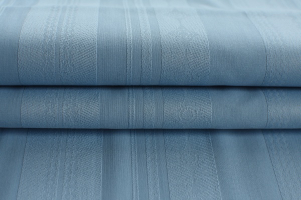 Cotton jacquard weaved fabric with a lower weight, called voile. Light blue colour with a pattern seen in the photo.