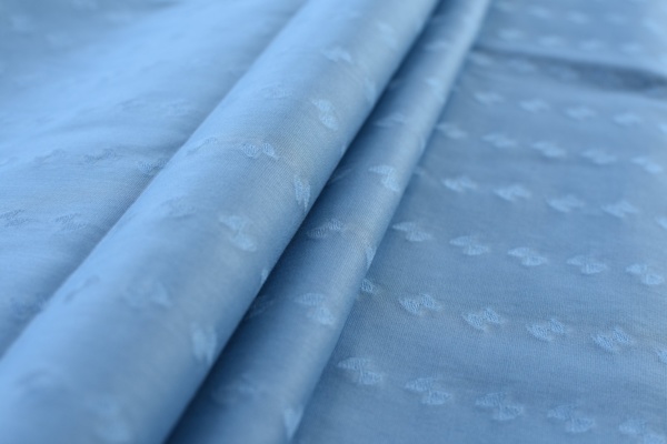 Cotton jacquard weaved fabric with a lower weight called voile. Light blue colour with a pattern.
