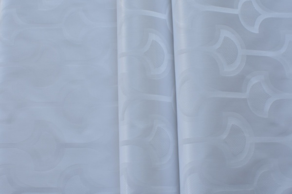 Cotton fabric of jacquard weaving with a higher weight called African brocade. The fabric is white and the pattern can be seen in the photo.