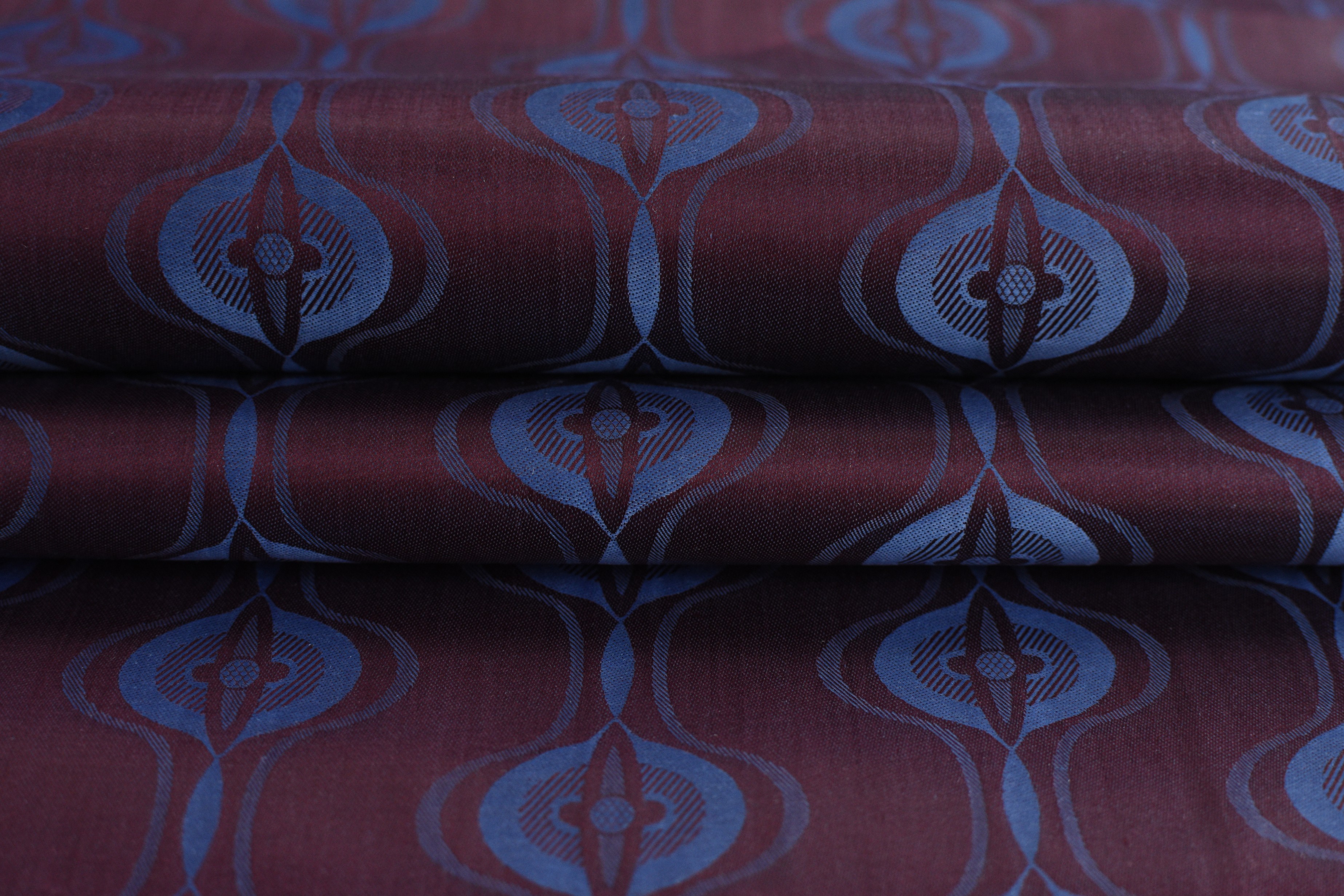 Bavlnená látka žakárového tkania s vyššou gramážou – tzv. africký brokát. Vínová farba s fialovým vzorom.