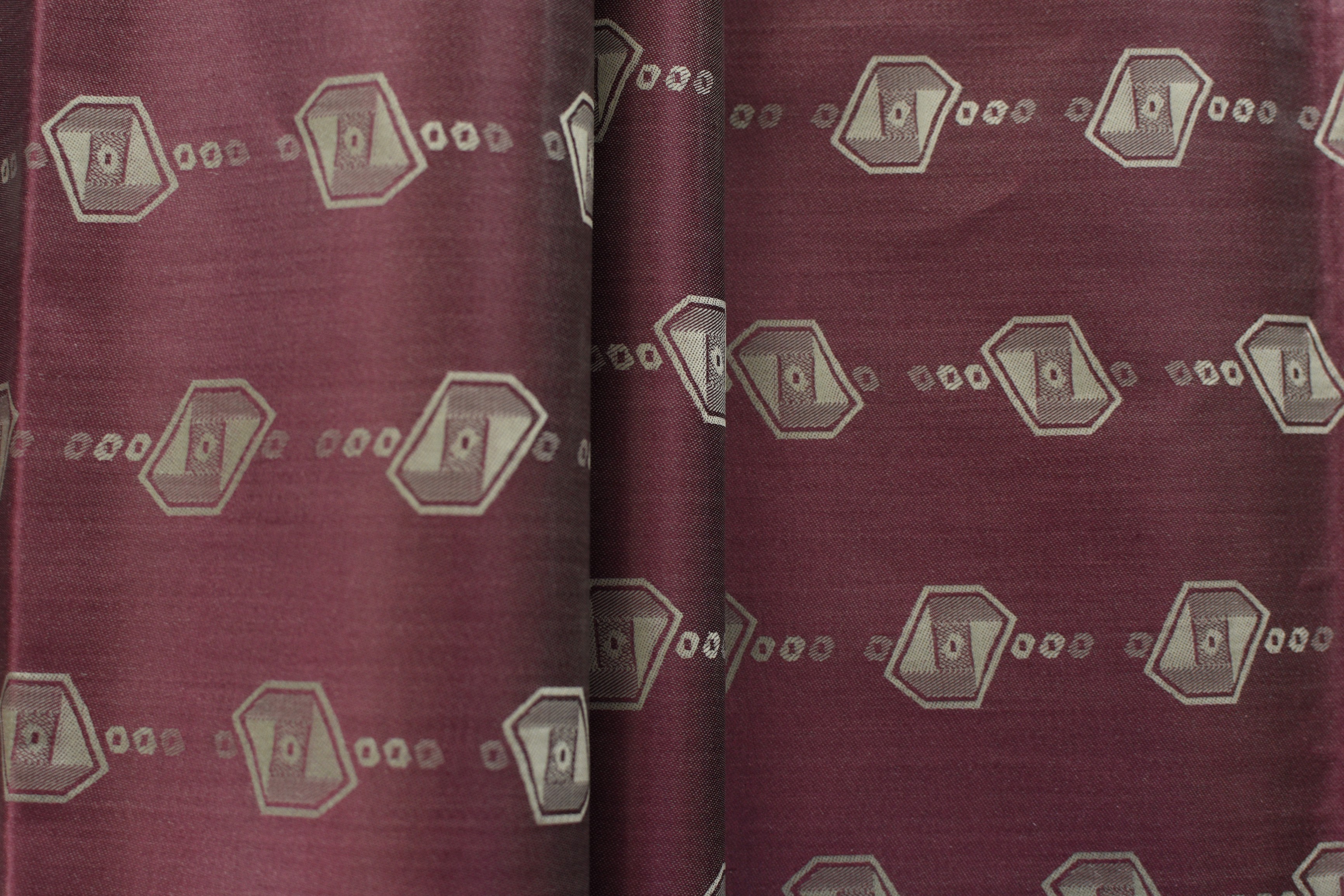 Bavlněná látka žakárového tkaní s vyšší gramáží – tzv. africký brokát. Červenohnědé barvy s béžovými vzory.