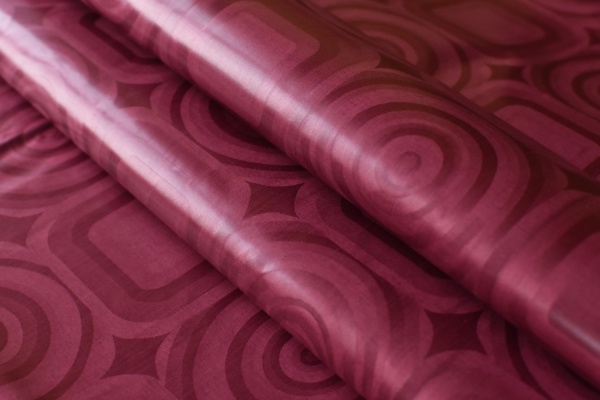 Bavlněná látka žakárového tkaní s vyšší gramáží – tzv. africký brokát. Barvy vínové se vzory.